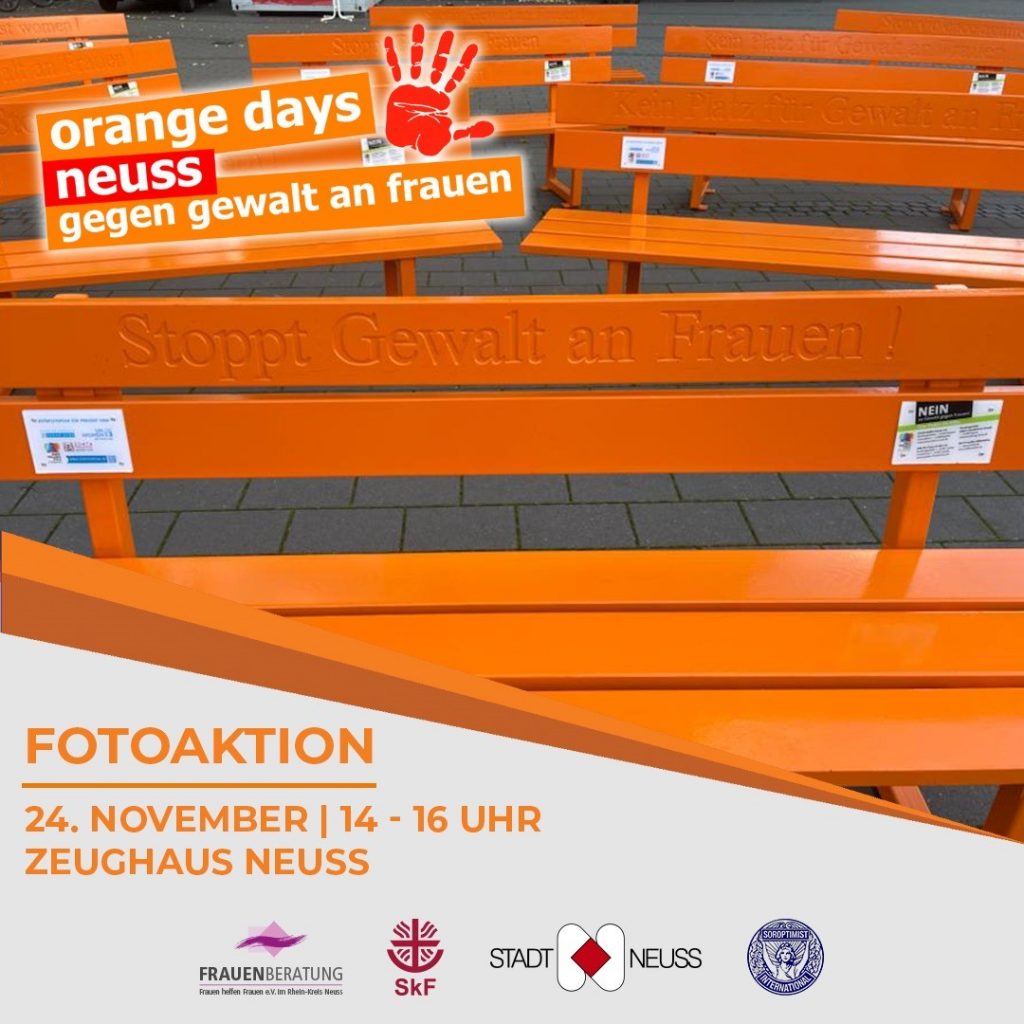 Im Rahmen der Orange Days 2025 ergreifen wir die farbenfrohe Initiative, um ein ernstes Thema in den Vordergrund zu rücken: Im Zentrum stehen vier leuchtend orangefarbene Bänke, die in Neuss vor dem Zeughaus aufgestellt sind und Passanten dazu einladen, Teil der Bewegung zu werden. Diese Bänke sind nicht nur ein Symbol für Solidarität, sondern auch Schauplatz einer besonderen Fotoaktion.